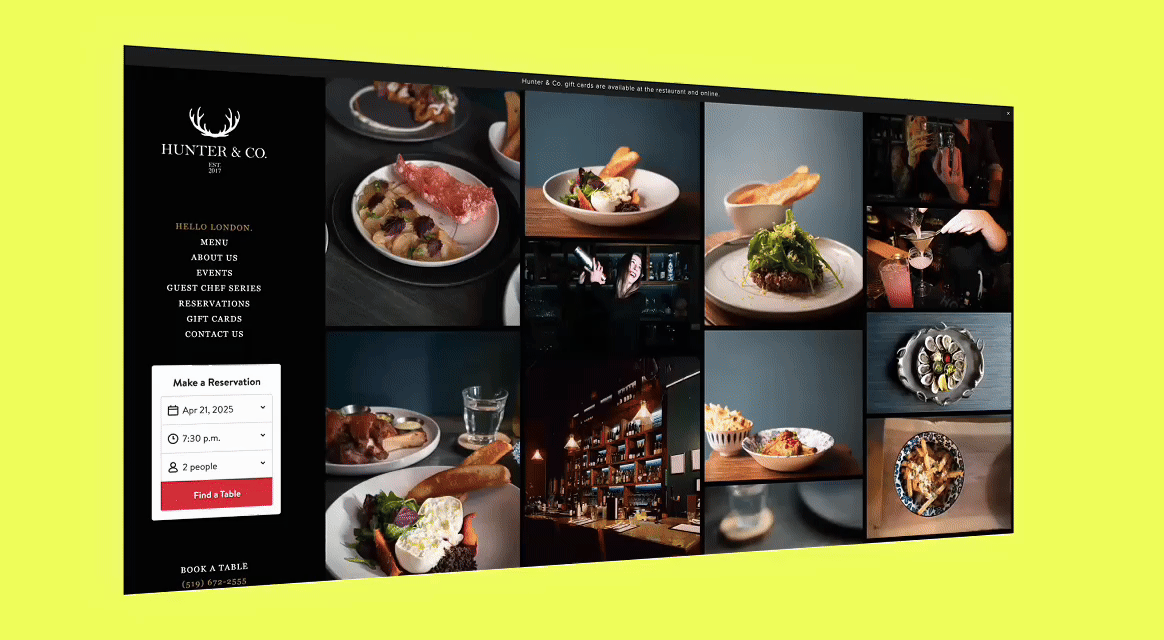 I managed the social media and website for Hunter & Co., a fine-dining restaurant in downtown London, Ontario. My role included customizing the restaurant’s website on Squarespace, optimizing SEO, and handling all back-end maintenance tasks.